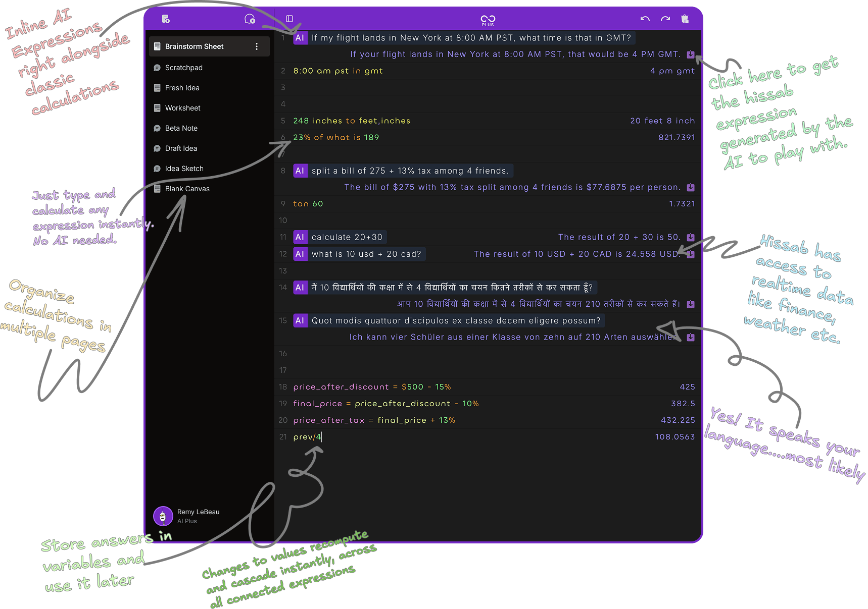 Hissab is the only calculator that combines full natural language with absolute accuracy.